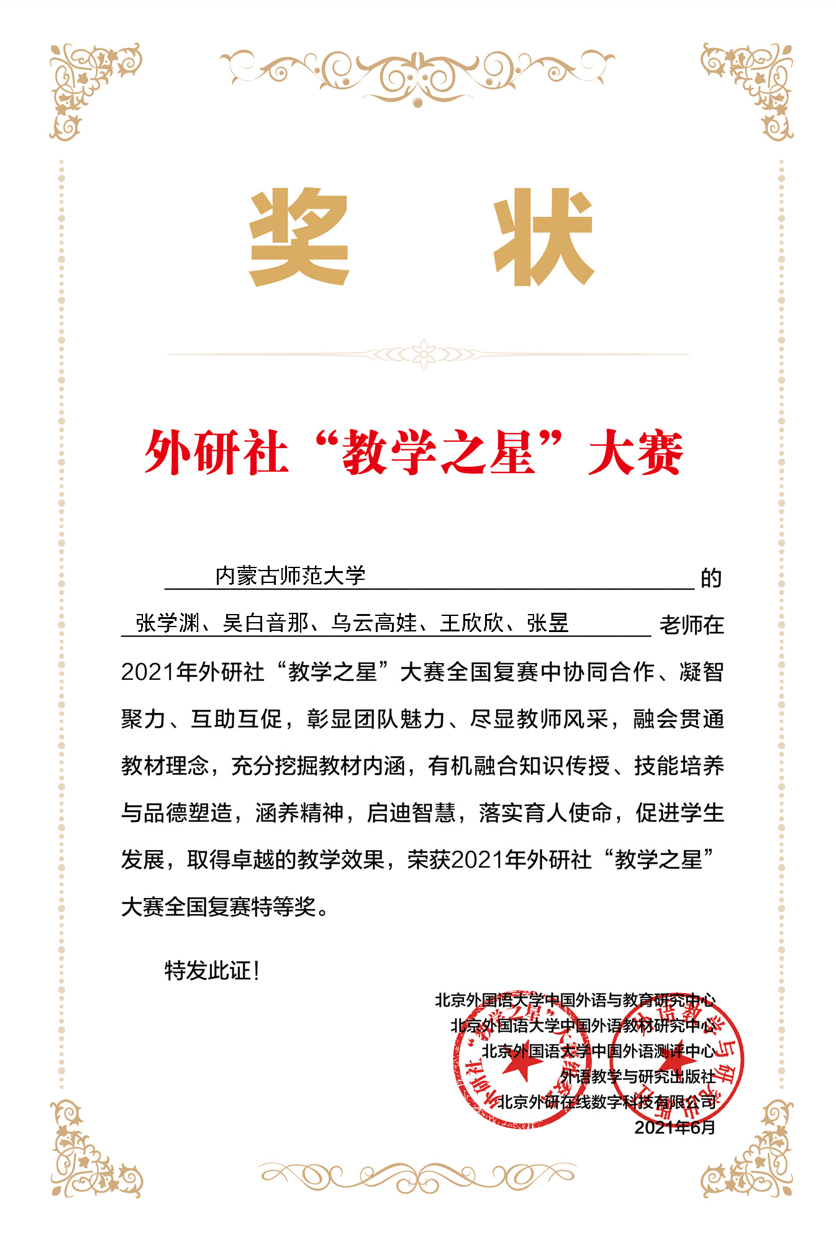 2021年8月1日,米兰官网ac米兰官网中文网站教师《交际英语》教学团队参加了2021年外研社“教学之星”大赛,张学渊担任说课,张昱担任讲课,吴白音那、乌云高娃、王欣欣三位教师担任成员。团队荣获全国英语专业组复赛特等奖,半决赛二等奖,全国总决赛三等奖。该成绩为内蒙古高校历年参赛的最好成绩,也是内蒙高校首次入围全国决赛。