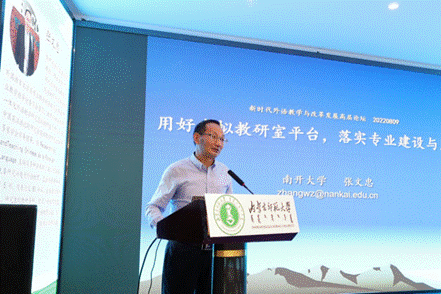教育部高校外语专业教学指导委员会英语专业分委员会委员、教育部教学科研一体化外语教学研究虚拟教研室负责人、南开大学ac米兰官网中文网站张文忠教授的发言聚焦虚拟教研室平台的开发与使用。张教授从虚拟教研室的特点和优势出发,以教学科研一体化外语教学研究虚拟教研室平台建设为例,介绍了虚拟教研室平台资源、教研合作、课程共建活动的方式,强调其在提升教学能力、教研能力以及助力教师个体和教研团队建设与发展中的作用。