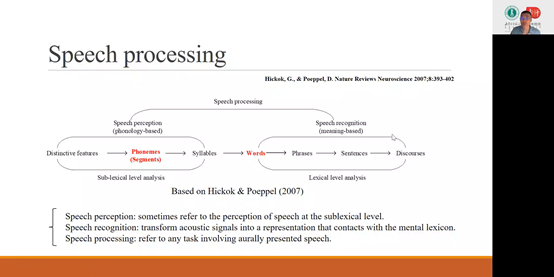 在讲解言语感知时,张昊博士首先指出“speech perception”多重称谓所造成的术语混淆的问题,进而重点区分了“speech processing”,“speech perception”,和“speech recognition”几个术语的不同内涵和细微差别,强调在使用具体术语时应保持严谨,做到统一。随后,张昊博士细致讲解了言语链的工作原理,同时强调言语的感知与声学密不可分,指出可根据语音的声学线索,如元音感知、辅音感知和声调感知,进行不同的音位区分。在这一部分,张昊博士还普及了多个重要的语音学术语,如共振峰,元音规整(vowel normalization)、过渡音征(formant transition)、和基频曲线等,又通过援引经典文献,分享了语音感知研究的常用研究方法和实验范式,这些知识都极大地丰富和拓展了师生对语音学的理解。