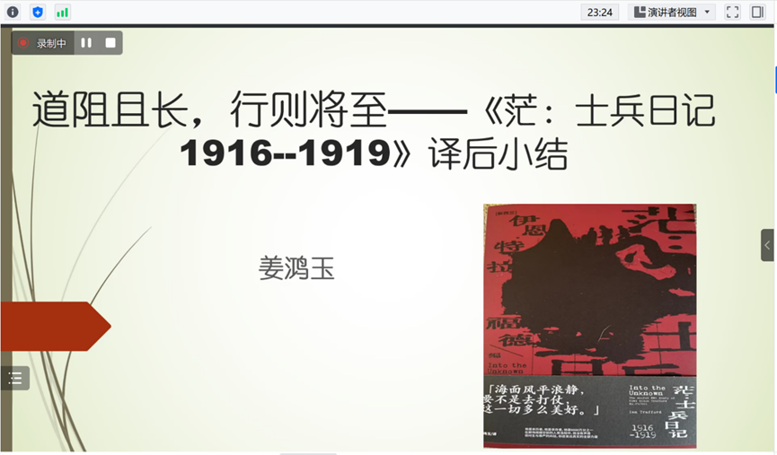 讲座中,主讲嘉宾姜鸿玉老师首先介绍了其最新出版的译著《茫:士兵时间(1916--1919)》的主要内容,并从作者——译者——读者的三元关系出发,以文本为中心,详尽介绍了她在译前、译中、译后所做的工作,与师生们分享了翻译这本书的心得体会,给与会师生带来很多启发。