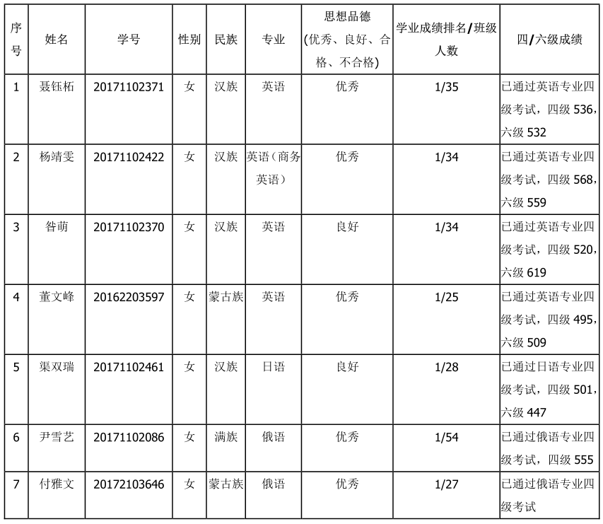 成员:索米娅,黄通拉嘎,阿拉木斯,苏日娜,娜日莎,常慧,吕志云,徐戌,白杰,各毕业班班主任。通过学生本人申请、学院审核、面试及召开推免工作会议,经学院推免工作领导小组综合评议并研究决定:拟推选聂钰柘等7位同学位为免试攻读硕士学位研究生。为了体现公平、公正、公开的原则,现对拟推荐名单予以公示。