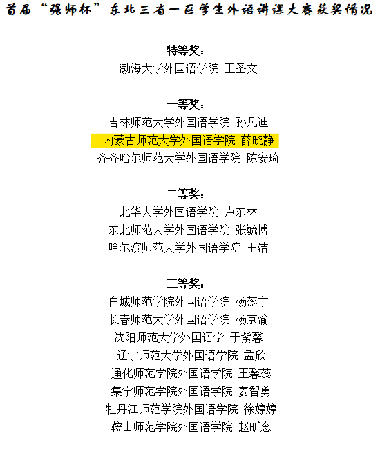 会议期间,评委会对首届“强师杯”东北三省一区学生外语讲课大赛的参赛作品进行评选,本次大赛共19所学校派选手参加。经过评审,最终评选出特等奖一名、一等奖三名、二等奖三名、三等奖八名。由米兰官网呼和塔拉老师指导的薛晓静同学凭借教学设计、课件制作和模拟授课等环节的突出表现,最终在大赛中脱颖而出,荣获一等奖。
