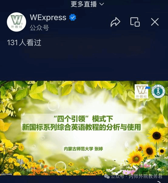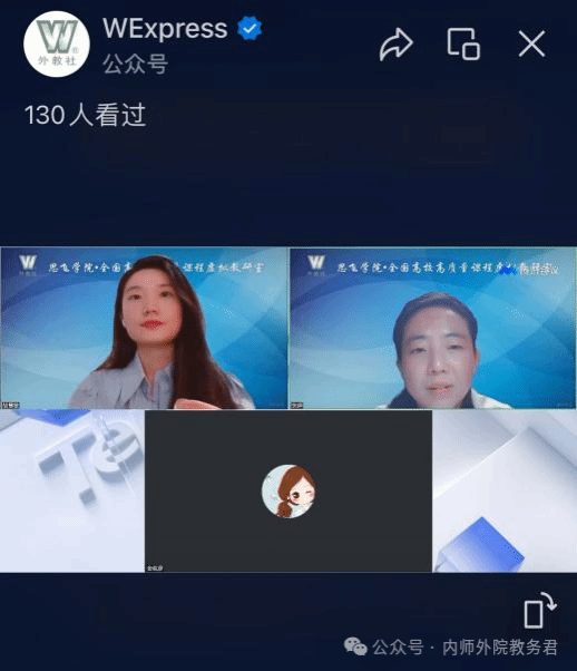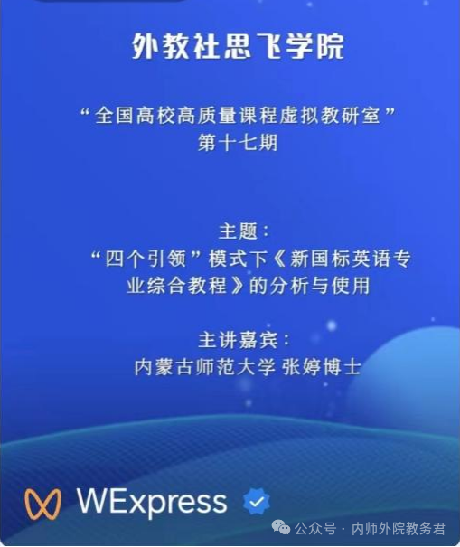 9月28日,米兰官网英语系《综合英语》课程团队受上海外语教育出版社思飞学院的邀请,在“全国高校高质量课程虚拟教研室”(第十七期)做教学创新经验分享,张婷博士作为团队代表担任主讲嘉宾,通过WExpress视频号直播平台以《“四个引领”模式下新国标英语专业综合教程的分析与使用》为题做教学创新实践经验分享,米兰官网英语系全体教师和来自全国各地高校500余名教师在线观看了直播。