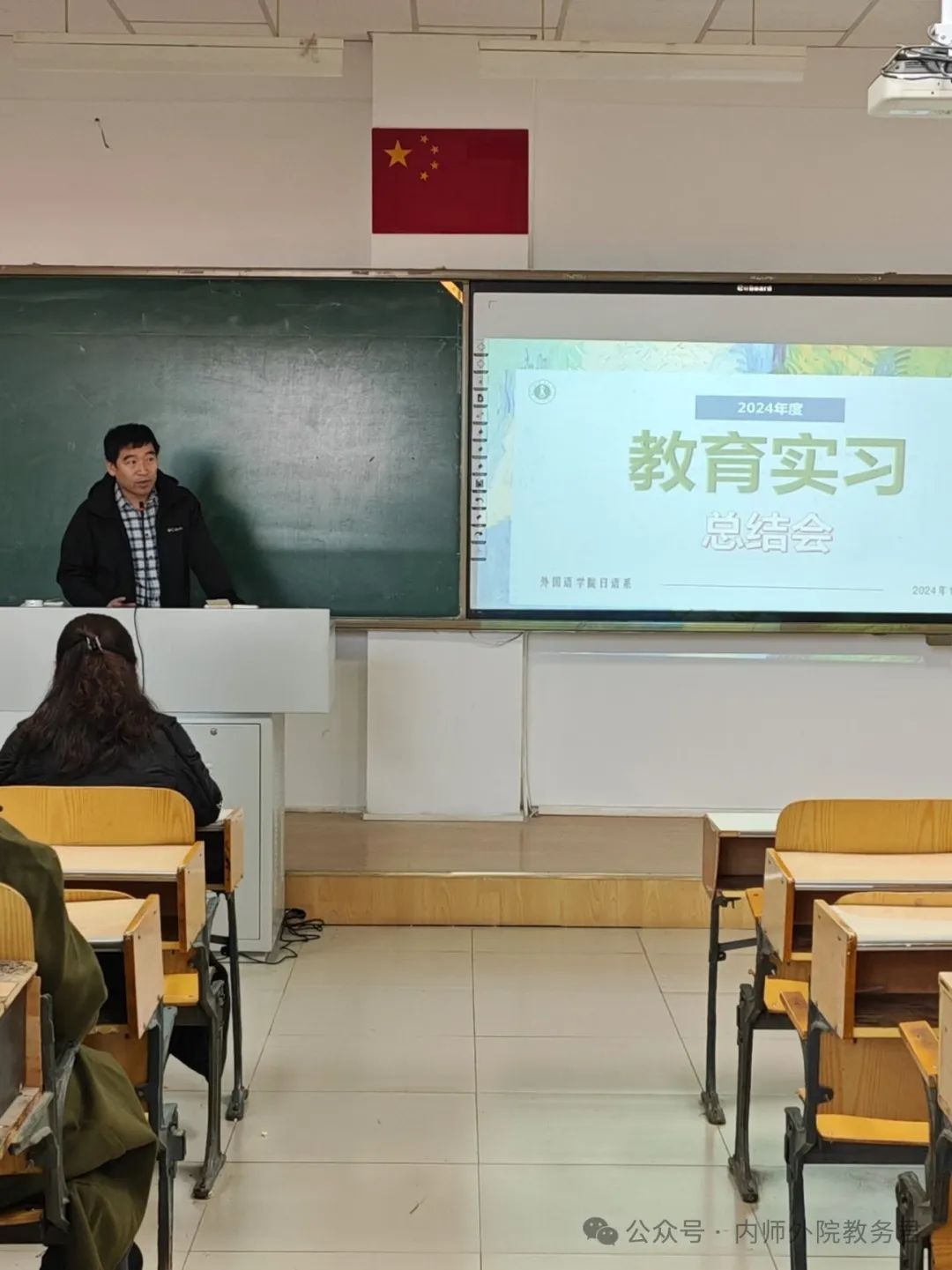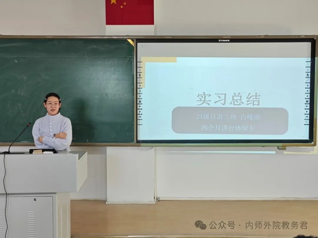 塔娜作为校内指导老师代表从专业实习和班主任实习两方面点评了2021级日语专业学生实习情况,充分肯定了实习生的教学能力、专业知识和班主任工作方法,强调了教育实习能够增强交流沟通能力这一意义,并且寄语同学们继续努力,让实习经历成为今后人生道路上的宝贵财富。