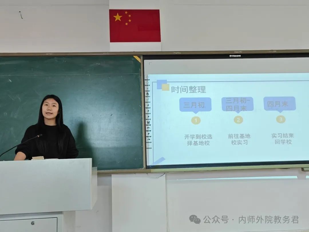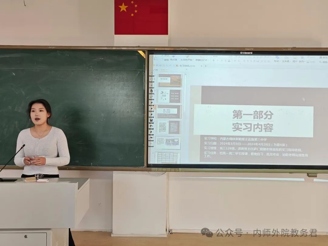 首先,傅成浩介绍了日语专业的实习概况,包括实习基地情况,实习基地的选择方式和21级教育实习的基本情况。日语专业实习基地分布在内蒙古自治区的呼和浩特市、包头市、锡林郭勒盟等6个盟市。学生可以通过ac米兰官网中文网站双选平台、院派和自主实习的方式选择实习基地。2021级日语专业全体学生参与了本次实习,实习期为8周,期间得到了实习基地老师和校内指导老师的共同指导,圆满完成了听课、授课、班级管理等实习工作。