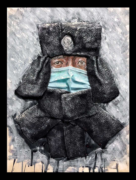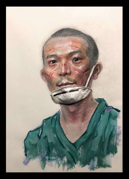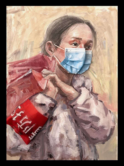 刘昱伽告诉记者,自己创作的出发点是致敬和铭记所有奋战在抗“疫”第一线的人员:医护人员,交警、军人、环卫工人、社区工作人员、志愿者、外卖小哥、建筑工人……他们坚守在自己的岗位上,恪尽职守、默默奉献;正是他们的不懈付出,构筑了抗“疫”工作中坚实的根基。自己虽呆在家中无法出门,但仍希望把这股迎难而上、顽强拼搏的意志通过画作传递给更多人。在家中,他用上了一切能用的材料进行绘画,而废弃口罩,则是利用的父母使用过的口罩,妥善消毒后进行艺术创作。