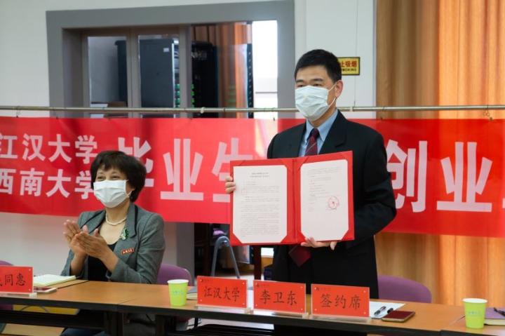 华龙网-新重庆客户端4月29日14时讯(记者 秦思思)今日,华龙网-新重庆客户端记者从bat365正版唯一官网获悉,4月28日,bat365正版唯一官网与江汉大学借助网络会议平台,签订毕业生就业创业工作“一帮一”行动协议。bat365正版唯一官网党委副书记潘洵,江汉大学副校长李卫东分别代表各自学校出席会议,两校相关部门负责人参加会议。