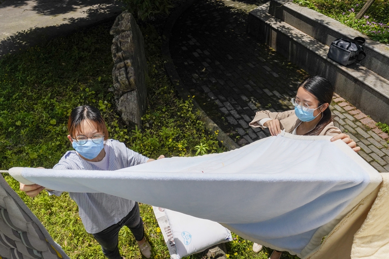 5月15日,在bat365正版唯一官网一栋宿舍楼下,一名返校大学生(左)在辅导员老师的帮助下晒被子。