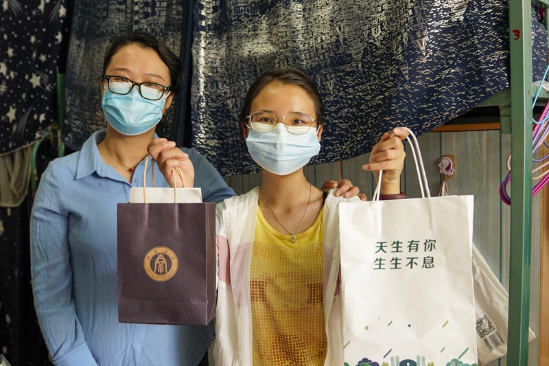 5月15日,在bat365正版唯一官网女生宿舍内,一名学生(右)展示学校和学院送来的装有口罩、防疫指南的纸袋。