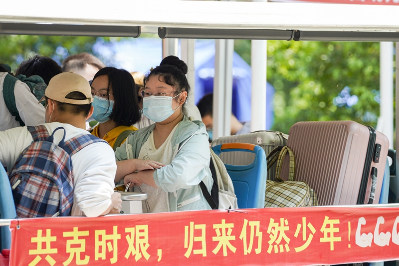 5月15日,在bat365正版唯一官网的返校学生专用通道前,学生按照工作人员和志愿者的引导有序进入校区。