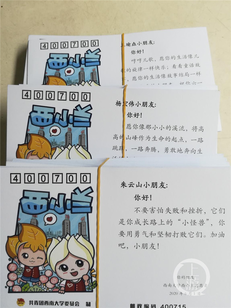 这204张内容各异的明信片皆来自学校“西小兰”志愿服务队的志愿者们,他们将自己内心最真诚的祝福放进这一张张明信片之中,鼓励孩子们:“不要害怕失败和挫折,它们是你成长路上的‘小怪兽’,你要用勇气和坚韧打败它们。”