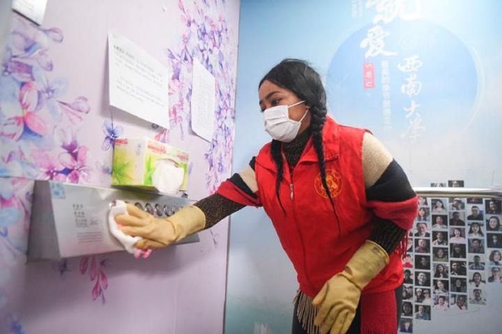 除了心理疏导,阿丹还参与了门岗执勤,定期为学生宿舍区域消毒,给留校学生派发口罩。对于取消了回家的计划,阿丹说:“我希望可以留在中国给大家增添勇气和微笑。做志愿者就是我对我的第二故乡中国加油的一个方式。”