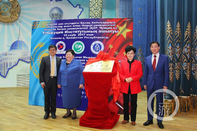 2017年4月学校合作共建的阿布莱汗国际关系与外国语大学孔子学院揭牌仪式。