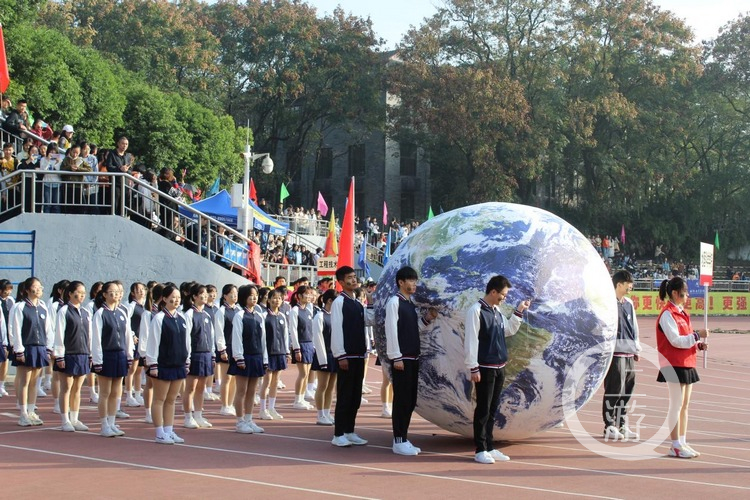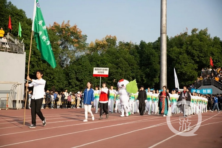 领跑在动物医学院前列的熊本熊、棉尾兔、加菲猫瞬间吸引大家的注意,学子们呼唤构建“生命共同体”的时代命题;“绿水青山就是青山银山。”一株株绿植成为资源环境学院学子手中的“宝藏”;“绿色药丸,请坚持服用。”两枚绿色药丸传达的是药学院对生命健康的呼唤;“地球”也化身“迷你版”,被地理科学学院学子带入操场;新闻传媒学院举起全国60余个主流媒体的标识、台标、报徽;音乐学院手持乐器和小黄鸭气球;物理科学与技术学院举也有物理方程式……