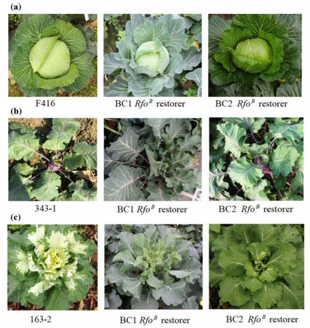 甘蓝类蔬菜包含结球甘蓝、花椰菜、青花菜、苤蓝、孢子甘蓝和芥蓝等不同变种,表型差异十分丰富。目前,Ogura CMS不育系已经成为甘蓝类蔬菜杂种优势利用最普遍的育种途径。Ogura CMS细胞质雄性不育基因位于细胞质内,位于不育材料(品种)中的优异性状无法被分离出来与其他优异性状进行组合而被再利用,形成优异种质资源再利用的技术封锁,阻碍甘蓝类蔬菜优异育种材料的创新。为了突破Ogura CMS不育系的技术封锁,研究所将来自萝卜的RfoB恢复基因优化后转入结球甘蓝中,创制了结球甘蓝Ogura CMS恢复系(图1),将该恢复系与不同类型的甘蓝类蔬菜杂交和回交创制了一系列(18种类型)甘蓝类蔬菜Ogura CMS专用恢复系(图2),并利用该恢复系成功转出了Ogura CMS品种GZ87的根肿病抗性(图3)。