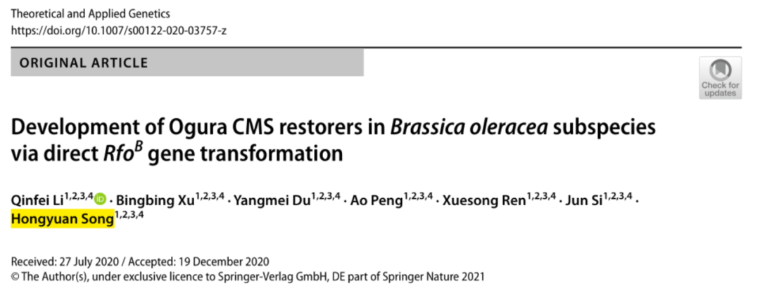 该成果论文发表在植物遗传育种领域国际知名杂志Theoretical and Applied Genetics,题目为Development of Ogura CMS restorers in Brassica oleracea subspecies via direct RfoB gene transformation。研究所李勤菲副教授、硕士毕业生徐冰冰、杜杨梅为共同第一作者,宋洪元研究员为通讯作者。