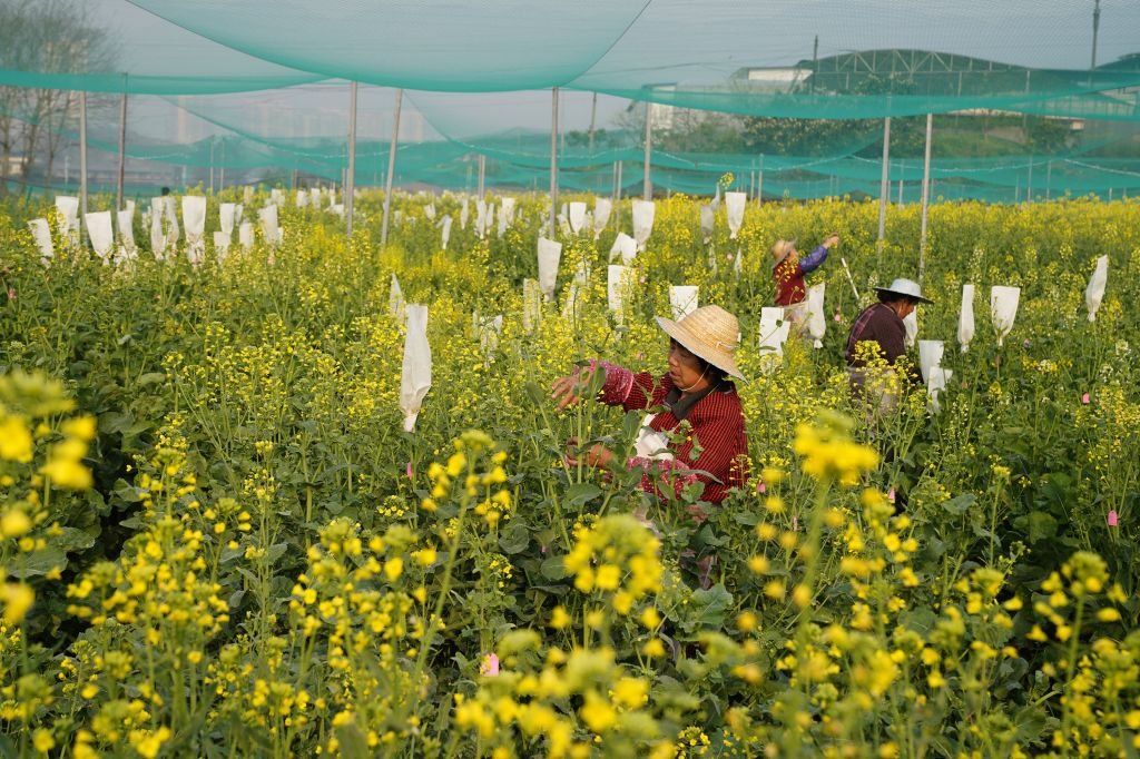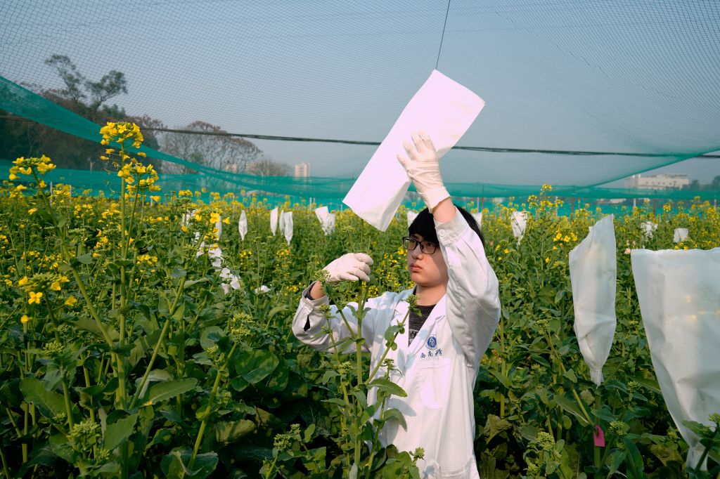 ↑2月22日,在重庆市油菜工程技术研究中心,bat365正版唯一官网农学与生物科技学院的学生在给油菜花套袋。