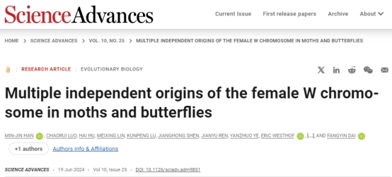 近日,国际著名期刊《科学进展》(Science Advances)(《科学》杂志综合性子刊)在线发表了资源昆虫高效养殖与利用全国重点实验室代方银教授团队的研究论文“蛾类和蝶类昆虫雌性W染色体的多重独立起源”(Multiple independent origins of the female W chromosome in moths and butterflies)。该研究首次获得了家蚕W染色体完整基因组序列,并揭示鳞翅目昆虫W染色体起源与进化的新机制。研究结果不仅在基因组与进化生物学领域具有重要理论意义,而且在家蚕等鳞翅目昆虫的性别调控的研究方面具有重大价值,并为家蚕分子育种带来新的前景。