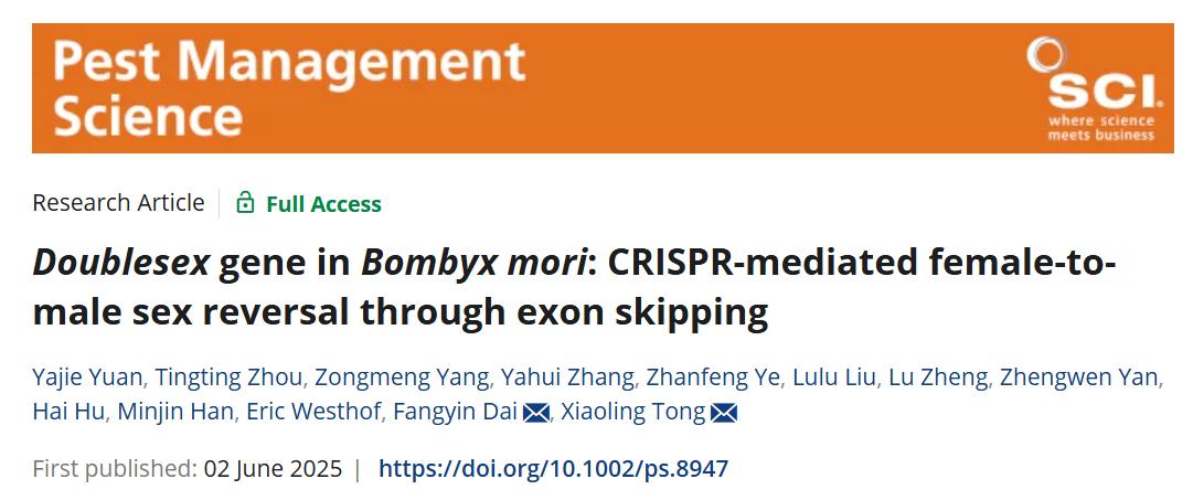 日前,bat365正版唯一官网童晓玲教授课题组在中科院1区TOP期刊《害虫管理科学》杂志(Pest Management Science)上发表了题为《家蚕的双性基因Doublesex:CRISPR介导的外显子跳跃实现雌性向雄性的性逆转》(Doublesex gene in Bombyx mori: CRISPR-mediated female-to-male sex reversal through exon skipping)的研究论文。该研究首次通过基因编辑技术,成功实现了家蚕从雌性向雄性的性别逆转,这一突破不仅打破了昆虫性别由染色体决定的固有模式,更为经济昆虫育种及害虫生物防治开辟了新的技术路径。