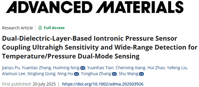7月20日,材料科学领域国际顶尖期刊《先进材料》 (Advanced Materials)在线发表了蚕桑纺织与生物质科学学院张同华教授/王蜀老师团队的研究论文《基于双介电层的离子电子压力传感器耦合超高灵敏度和宽范围检测,用于温度/压力双模传感》(Dual-Dielectric-Layer-Based Iontronic Pressure Sensor Coupling Ultrahigh Sensitivity and Wide-Range Detection for Temperature/Pressure Dual-Mode Sensing)。该研究创新性地提出了一种双介电层离子电子压力传感器(DLIPS)结构,成功实现了超高灵敏度与宽工作压力范围检测能力的统一,为柔性电子传感器的性能提升和多模态感知提供了新思路。