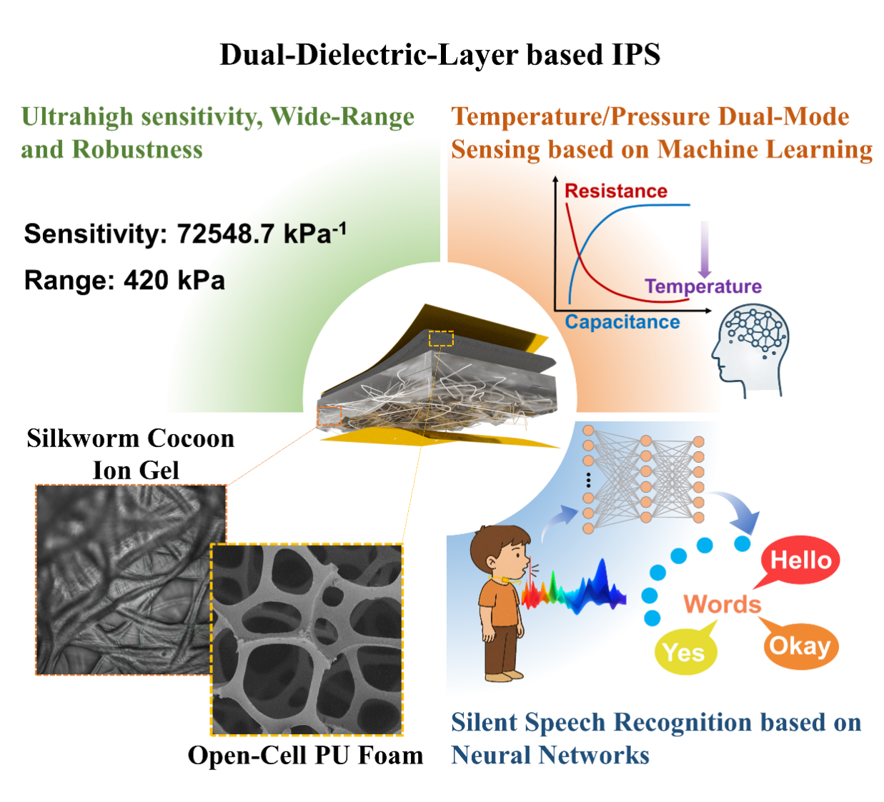 在人工智能与智能穿戴技术快速发展的背景下,传统压力传感器普遍存在灵敏度低、检测范围窄、响应饱和等技术瓶颈。研究团队基于天然蚕茧制备的离子凝胶(SCOG)与高压缩性聚氨酯泡沫(PU foam)的双介电层结构设计,实现了72548.7 kPa-1的超高灵敏度和0.001–420 kPa的超宽工作压力范围,最低可检测0.832 Pa微弱压力信号,展现出优异的响应速度(30 ms)和恢复速度(60 ms)与长期稳定性(超过5000次循环)。此外,该传感器具备温度/压力双模态感知能力,并通过深度学习模型实现了信号的准确解耦。在此基础上,团队进一步将该传感器应用于静音语音识别系统,结合LSTM神经网络,实现了高达98.5%的词汇识别准确率,为无声交流、人机交互等新兴应用领域提供了关键技术支撑。