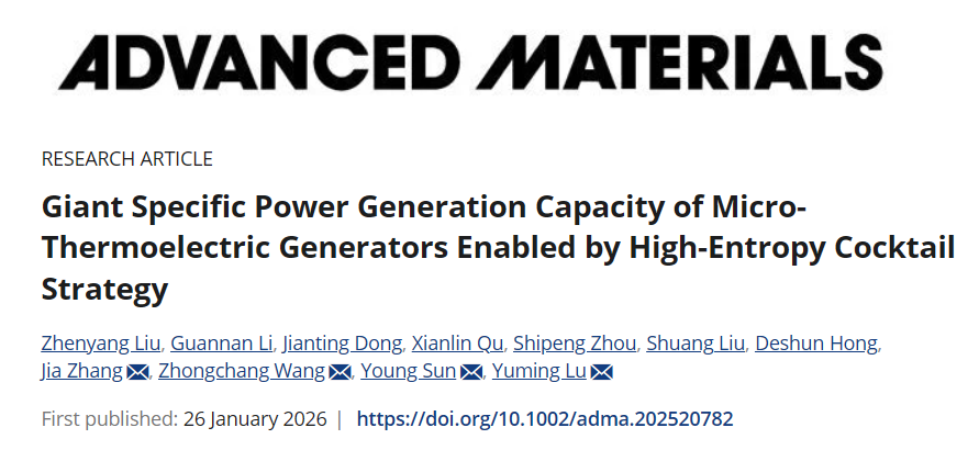 日前,bat365正版唯一官网、华中科技大学及重庆大学的研究团队协同攻关,在面向微型热电发电机的新材料研发领域取得重要进展。研究团队采用“高熵鸡尾酒策略”,成功制备出基于FeCoNi-Pt磁性中熵合金薄膜的微型热电发电机,其比功率发电容量达到约5000μW cm-2 K-2,较此前报道的最高值提升超过一个数量级。相关成果以《通过高熵鸡尾酒策略成功构筑巨比功率发电容量的微型热电发电机》(Giant Specific Power Generation Capacity of Micro-Thermoelectric Generators Enabled by High-Entropy Cocktail Strategy)为题发表于材料科学领域顶级期刊《先进材料》(Advanced Materials)。