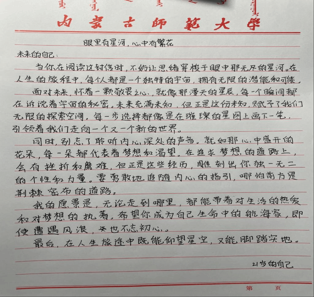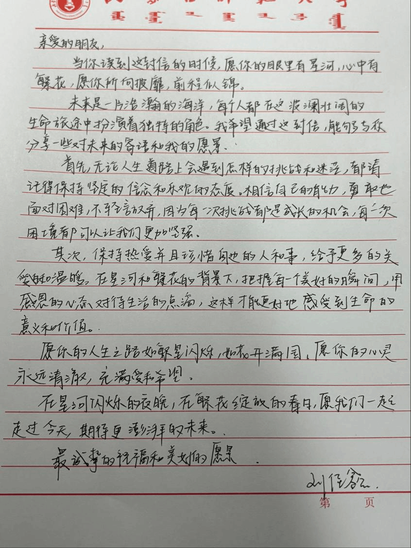 在这些优秀作品中,我们看到了学生对自己、对朋友的美好愿景。通过此次活动,让同学们能更好地认知自我,善待自我,关爱他人,健康成长,促进学生全面协调发展,增强他们对未来的责任感和担当精神,从而更加珍惜现在的生活和机会。让阳光照进心里,让你我眼里有星河,心里有繁花。