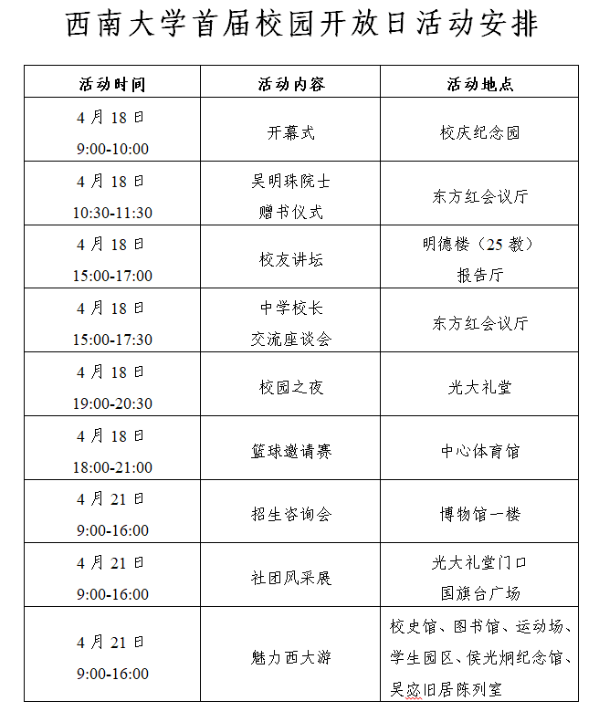 为让广大考生、家长及社会各界人士进一步了解学校良好的育人环境与办学条件、办学特色与师资力量、创新人才培养、大学学习与生活等情况,加强学校与社会的沟通交流,提升社会各界对学校的认知和认同,学校决定于2018年4月18日-21日举办bat365正版唯一官网首届“校园开放日”活动。