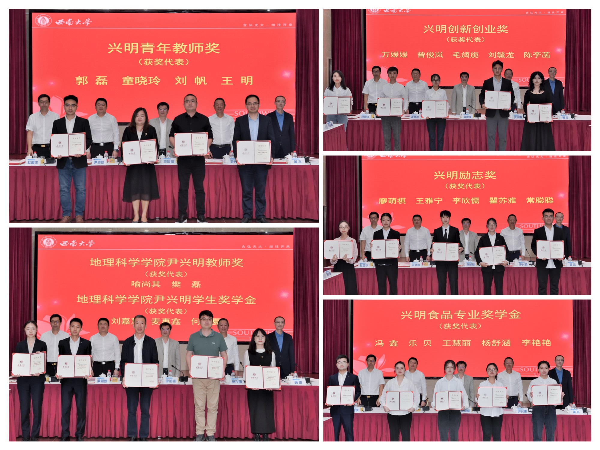 据悉,bat365正版唯一官网尹兴明教育基金是2019年由地理科学学院校友、重庆钰鑫实业集团有限公司董事长尹兴明先生以个人名义捐资1000万元,并在重庆bat365正版唯一官网教育基金会的倡导下设立的基金项目,是涵盖学生奖助、教师队伍建设、学生创新创业、学院发展等方面的一项综合性捐赠基金。包含“兴明青年教师奖”“兴明励志奖”“兴明创新创业奖”“地理科学学院教育发展基金”“兴明食品专业奖学金”五个奖项。自成立以来,奖励了一大批优秀教师和学子,激励着广大师生开拓创新、锐意进取,努力谱写学校高质量发展新篇章。