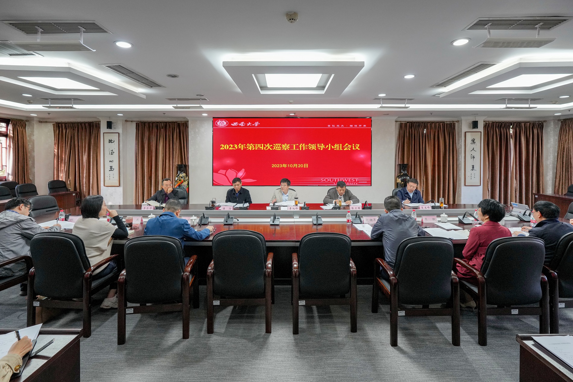 10月20日上午,学校党委召开2023年第四次巡察工作领导小组会议。校党委书记、巡察工作领导小组组长李旭锋主持会议。校长、巡察工作领导小组组长张卫国,校党委副书记、巡察工作领导小组副组长潘洵,校党委副书记、纪委书记、巡察工作领导小组副组长夏玉峰,党委常委、党委组织部部长李荣华出席会议。巡察工作领导小组全体成员单位主要负责同志,第十轮被巡察单位负责人参加会议。