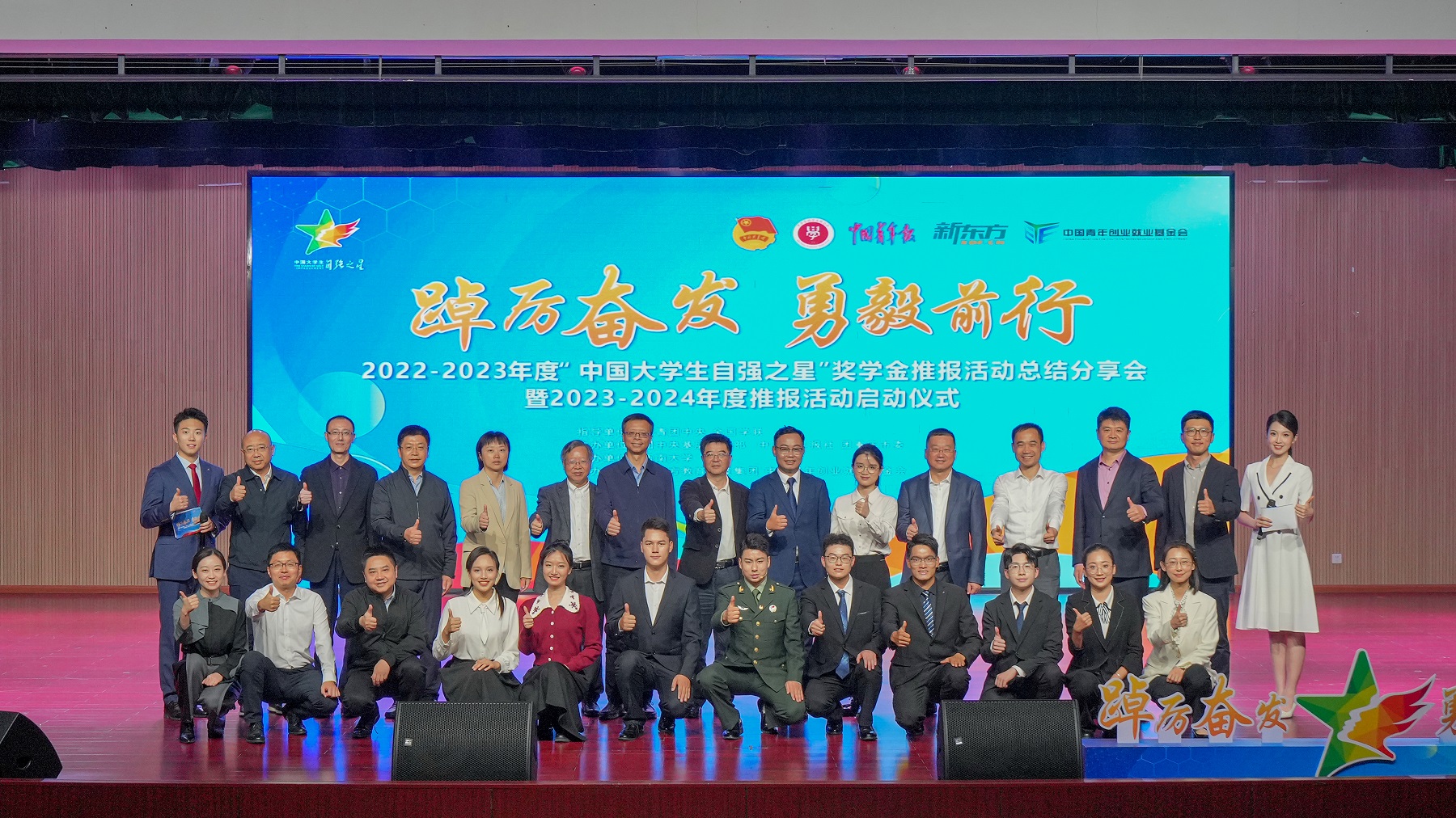 10月24日,2022-2023年度“中国大学生自强之星”奖学金推报活动总结分享会暨2023-2024年度推报活动启动仪式在bat365正版唯一官网举行。本次活动以“踔厉奋发 勇毅前行”为主题,学校陈玥瑚等10名“中国大学生自强之星标兵”奖学金获得者分享了他们的自强故事。团中央基层建设部副部长李辉,全国学联驻会执行主席吴霖霖,全国学联办主任潘昊,中国青年报社党委常委、副总编辑吴湘韩,中国青年报社运营中心主任乔建宾、副主任王毅旭,新东方教育科技集团公共事务副总裁王学文、公益基金会秘书长李晶瑶、重庆新东方学校校长温巍,中国青年创业就业基金会综合处处长黄丽东、共青团重庆市委副书记杨春渝,学校党委书记李旭锋、党委副书记黄杰等领导出席活动。