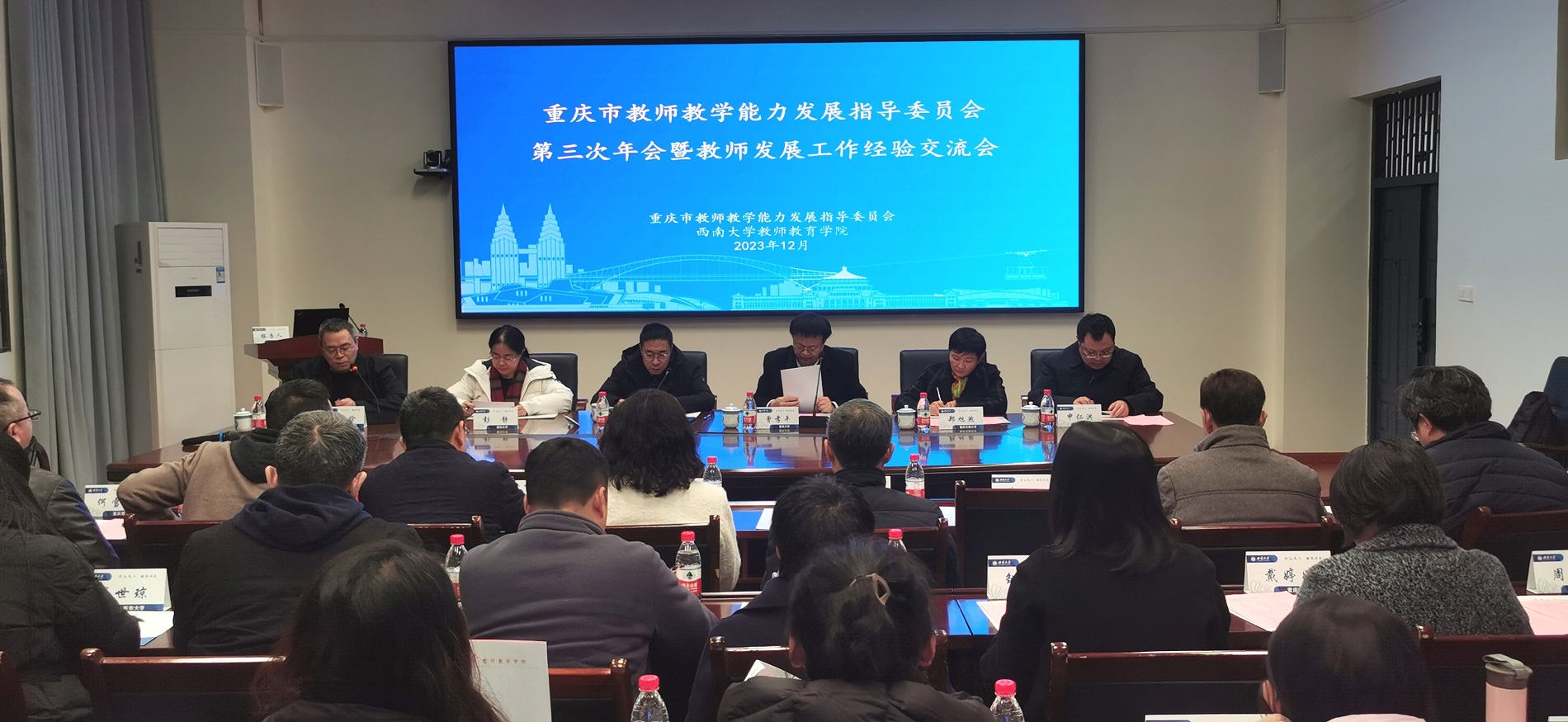 12月28日,重庆市普通本科高等学校教师教学能力发展指导委员会第三次年会暨教师发展工作经验交流会在学校召开,副校长韩旭东,重庆市普通高等学校教师教学能力发展指导委员会主任委员曾孝平和多位副主任委员、秘书长以及重庆各高校教师代表参加本次会议,会议由bat365正版唯一官网教师教育学院院长陈恩伦主持。