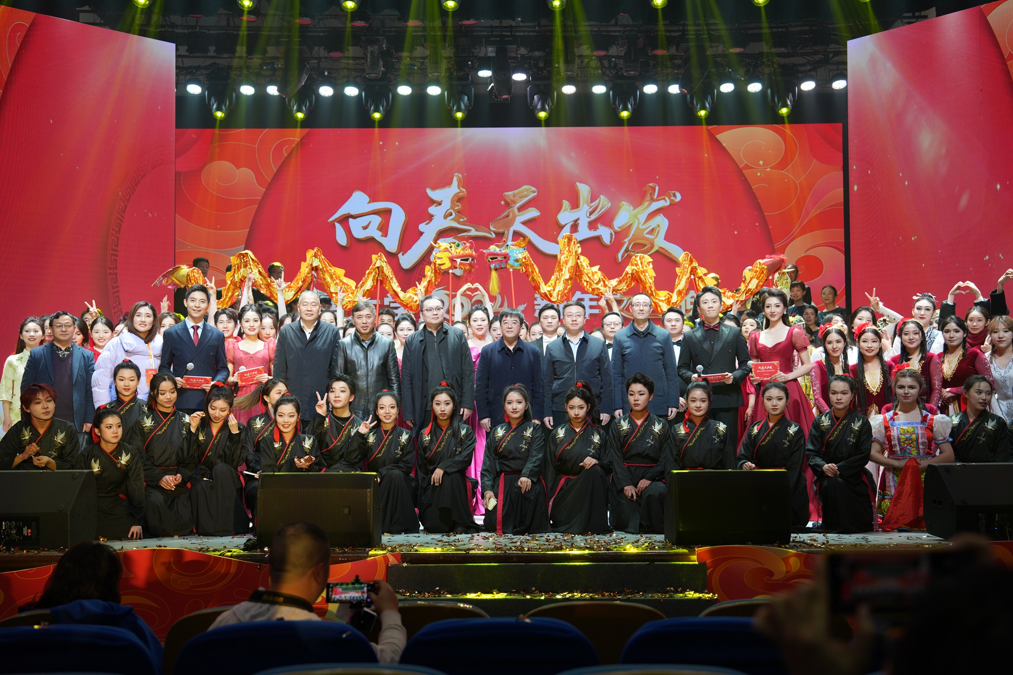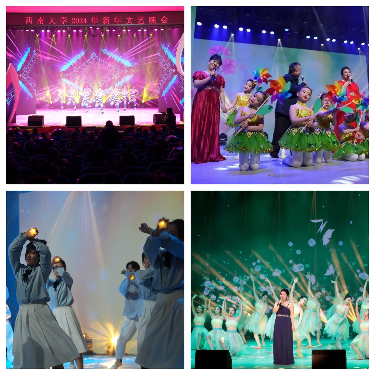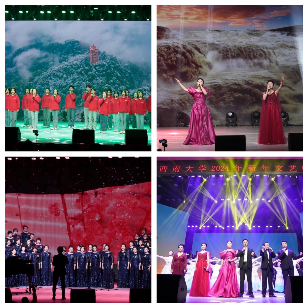 由新闻传媒学院带来的朗诵《向春天出发》开启了第四篇章“春之誓言”,学子们用青春之音述说着对春天的希冀,坚定地发出了“强国有我,请党放心”的铮铮誓言;音乐学院带来的歌曲《我的深情为你守候》《跟你走》激昂嘹亮,唱出了人们对祖国最深情地告白,吹响了“永远跟党走”的奋斗号角;来自“彩云之南”的校友们带来了合唱《我为共产主义把青春贡献》,彰显了代代西大人将青春热血洒满祖国大地,把青春奋斗融入党和人民事业的忠诚担当;接过时代的接力棒,今天的西大人自当踔厉奋发,勇毅前行,向春天出发、向梦想前进,与时代共振、与祖国同行,一曲合唱《我的祖国》将晚会气氛推向高潮。伴随着音乐《龙的传人》,晚会在师生们对新年的美好祝福中落下帷幕。