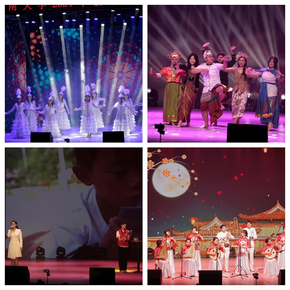 第三篇章“春光华夏”中,由学校民族艺术团带来的舞蹈《石榴花开》精彩演绎了“石榴花开映山红、民族团结大繁荣”的美好景象;国际学院的留学生们带来的舞蹈《舞动五洲》充满异域色彩,是文明交流互鉴的生动写照,表达了构建人类命运共同体的美好愿景;故事讲述《你笑起来真好看》节目述说了“西小兰”志愿者深入贫困乡村为孩子们拍摄肖像照,定格美丽笑容、助力乡村振兴的感人故事,既是对青年担当的生动描绘,也是对乡村振兴阶段性成效的精彩展现;最后,来自音乐学院的民乐合奏《花好月圆》更是奏响了祖国“春光无限好”的绚烂乐章。