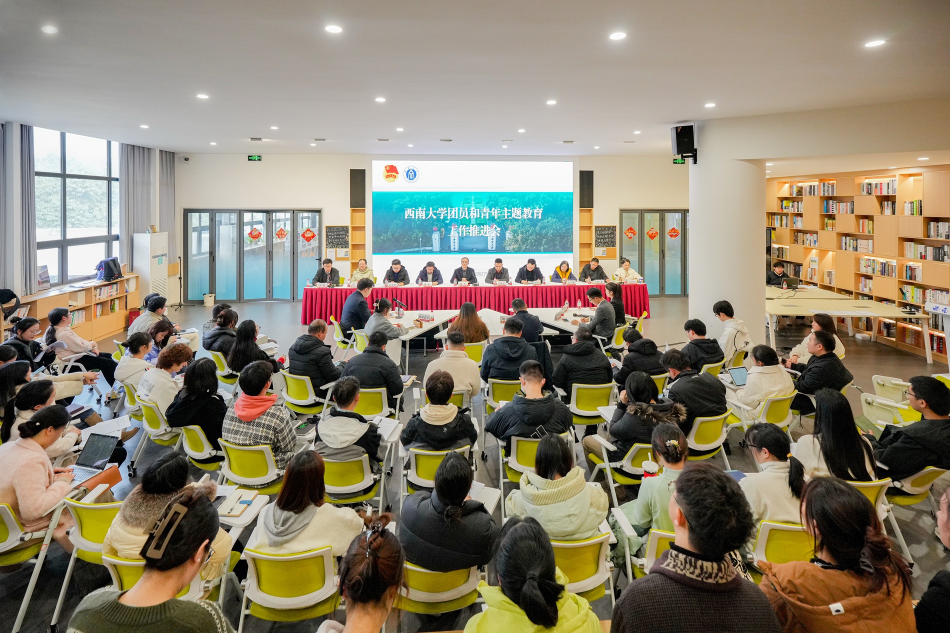 为梳理总结前一阶段学校团员和青年主题教育进展情况,持续推动工作向深向实开展,12月27日,学校召开团员和青年主题教育工作推进会,学校党委副书记、学校团员和青年主题教育领导小组组长黄杰,党委组织部、团委、机关党委、荣昌校区党工委、党委教师工作部、党委研究生工作部、党委学生工作部、马克思主义学院等学校团员和青年主题教育领导小组成员单位相关负责同志,各二级团组织书记、团支书和团员代表等参加会议。