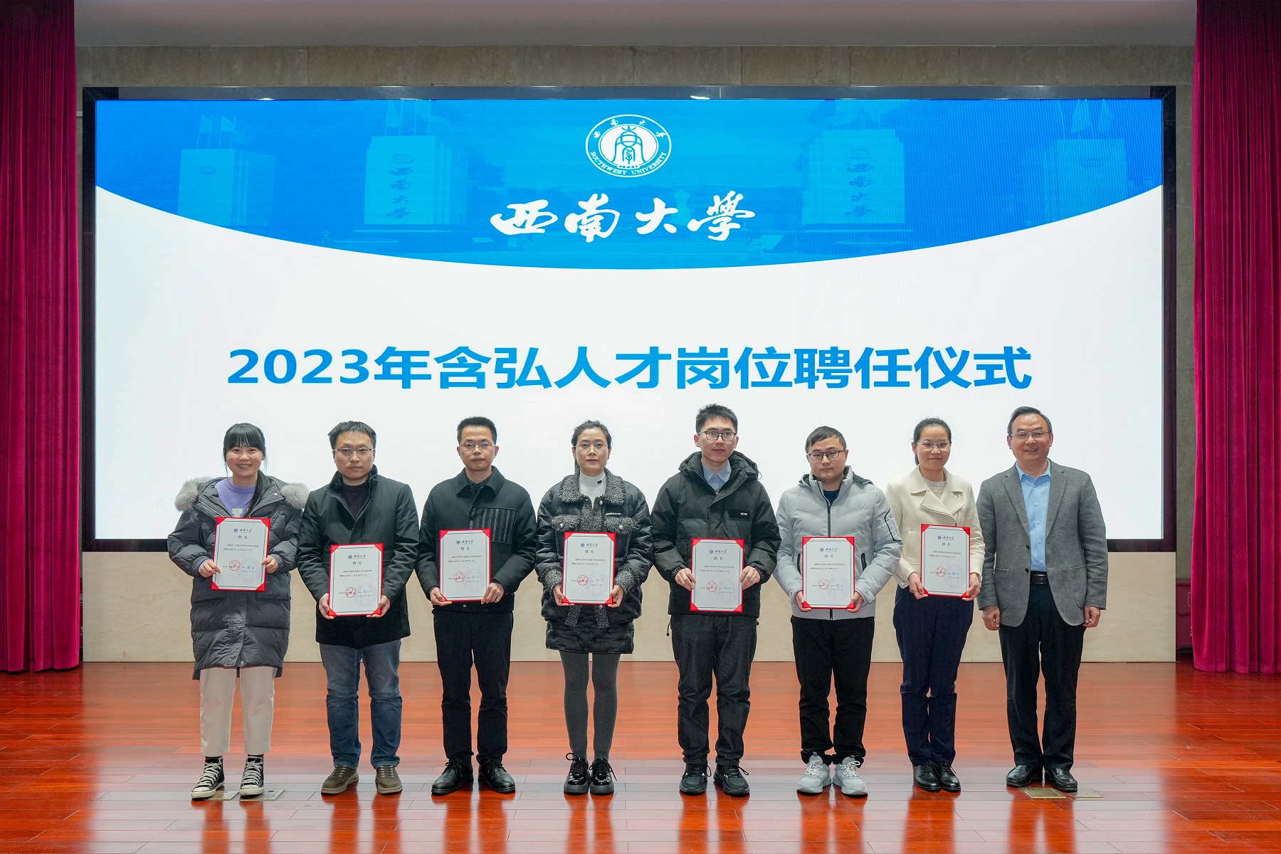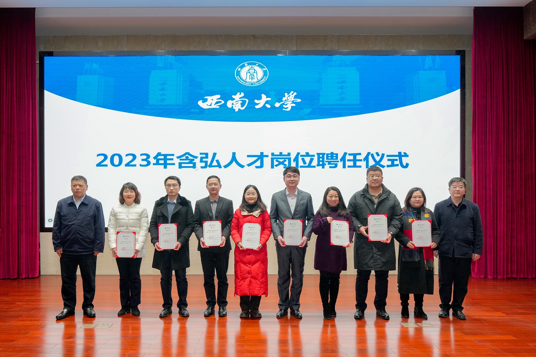 为充分发挥含弘岗位人才引领示范作用,促进以岗育才成效,推动学校高层次人才队伍建设。1月2日下午,学校在东方红会议厅举行了bat365正版唯一官网含弘人才岗位中期成果汇报展示会暨2023年含弘人才岗位聘任仪式。学校党委书记李旭锋,校长张卫国,党委副书记潘洵,副校长王进军、王志坚出席会议,相关职能部门负责人、部分二级单位负责人、含弘人才岗位代表以及师生代表等120余人参会。会议由潘洵主持。