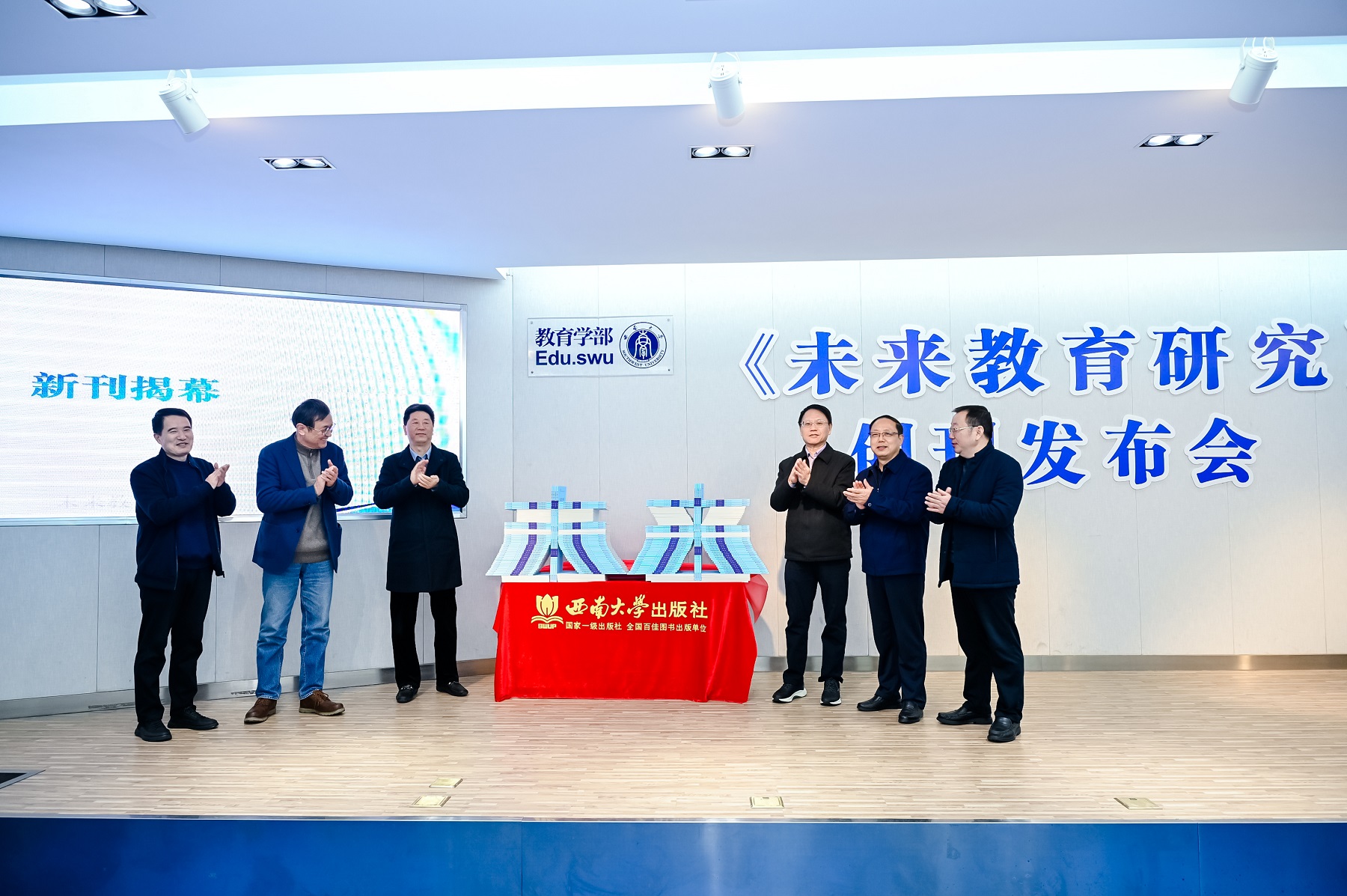 聘书颁发仪式后,副校长周光明,教育部西南基础教育课程研究中心主任宋乃庆,发展规划与学科建设部部长何林,《教育研究》原主编高宝立,bat365正版唯一官网出版社社长张发钧,bat365正版唯一官网期刊社社长张陈等与集刊主编、编委会主任一起为新刊揭幕。