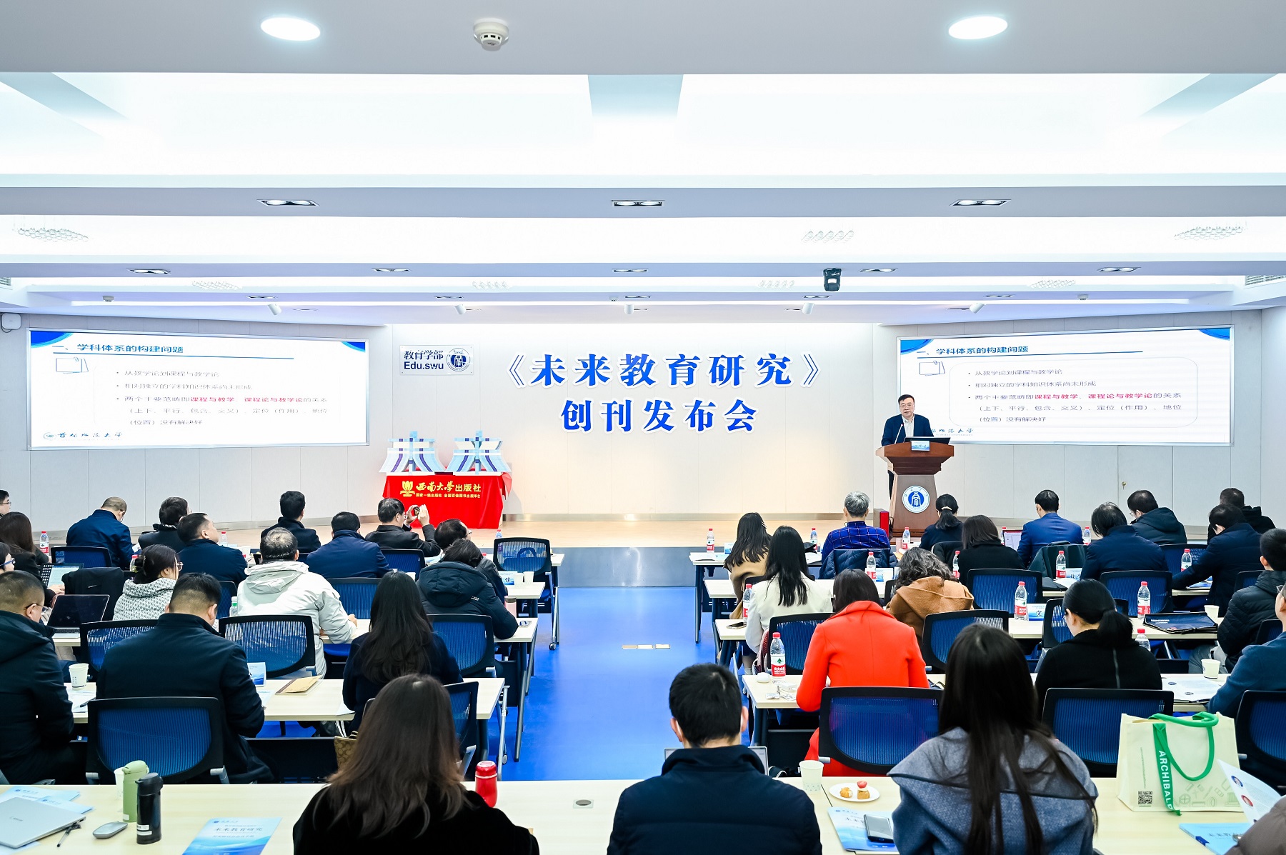 随后举行《未来教育研究》集刊创刊发布会,发布会由集刊主编朱德全主持。会上,学校领导为集刊主编、首届编委会主任以及成员颁发了聘书。集刊由朱德全教授、王牧华教授任主编,靳玉乐教授任编委会主任,校内外29位知名专家学者任编委会委员。