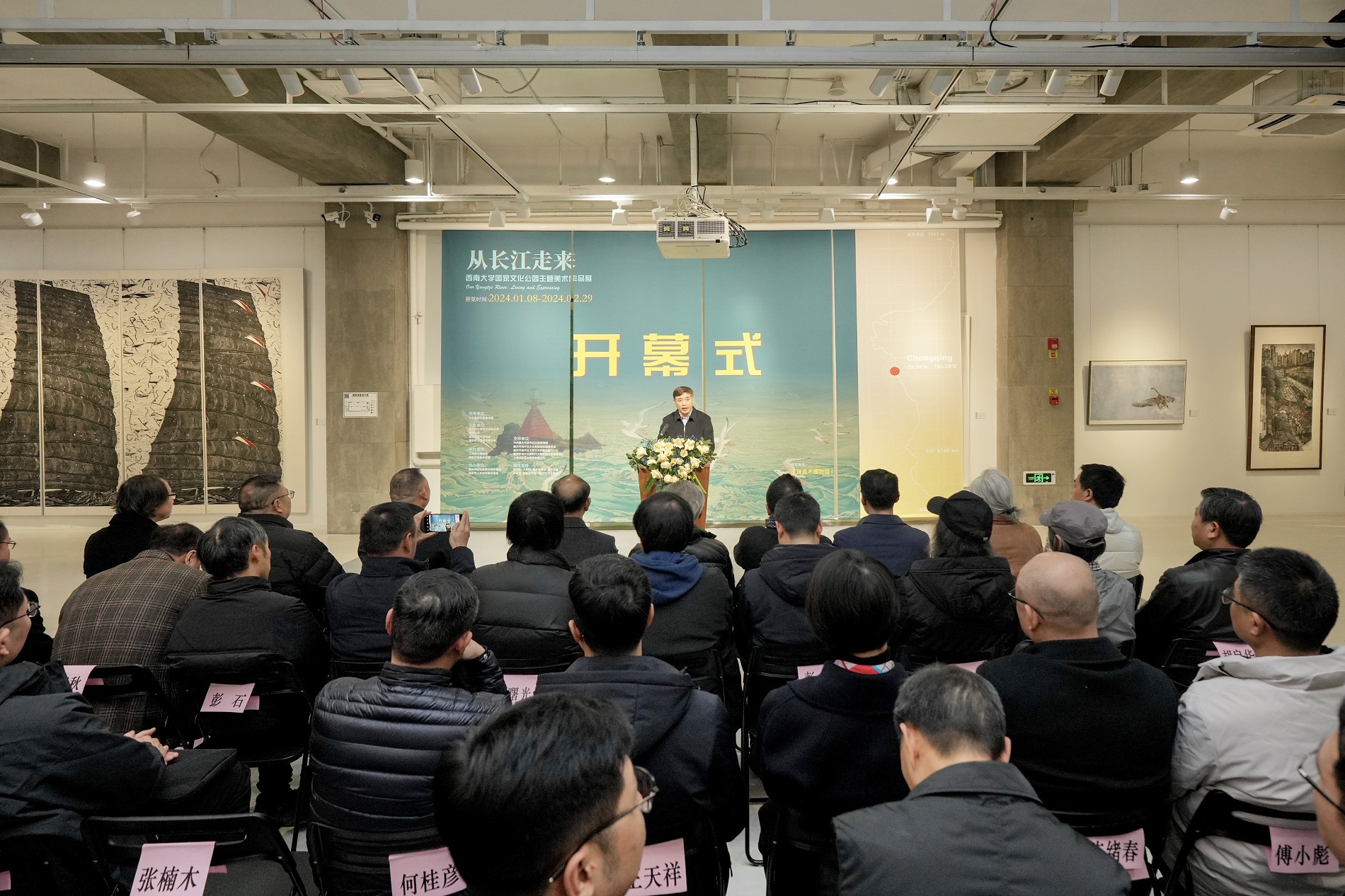 1月8日下午,“从长江走来——bat365正版唯一官网国家文化公园主题美术作品展”在王琦美术博物馆开幕。展览在市委宣传部的指导下,由市文联、bat365正版唯一官网、市美术家协会及市文艺评论家协会联合主办,王琦美术博物馆、学校美术学院承办,旨在进一步展示长江(重庆段)的文化资源和历史积淀,为新时代实施长江国家文化公园建设注入新活力,增强人民对长江文化的自豪感。市委宣传部、市文联、bat365正版唯一官网、市美术家协会、市文艺评论家协会相关领导,文艺界专家代表,川渝兄弟高校师生代表以及新闻界代表等共100余人参加开幕式。开幕式由美术学院党委书记张瑜主持。