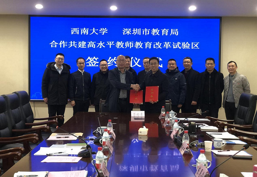1月11日上午,学校与深圳教育局合作共建高水平教师教育改革试验区签约仪式在教师教育学院208室举行。深圳市委教育工委副书记、市教育局党组成员杨平,深圳市教育局机关党委(人事处)相关人员;学校副校长韩旭东,国内合作处、教师教育学院相关人员参加会议。