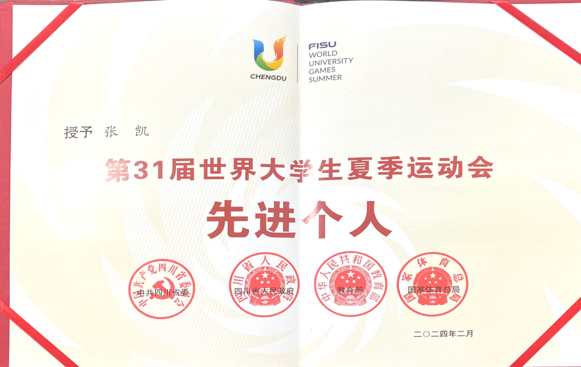 在本次赛事中,学校体育学院共有11名教师担任领队、教练员、裁判员,有14名学生入选网球、跆拳道、乒乓球、跳水、田径等项目代表队,共收获8枚金牌、5枚银牌、1枚铜牌。其中,李兵老师担任中国大学生体育代表团跆拳道队教练,指导训练我校张凯、刘贵成、吴瑞东3名同学参赛,取得1金1铜的成绩;2021级体育教学专业研究生郭涵煜在此次赛事担当中国大学生体育代表团入场式女旗手,并斩获网球女子单打冠军、网球女子双打亚军、网球团体亚军;2020级运动训练专业本科生张凯荣获跆拳道男子80kg冠军,实现中国大学生跆拳道代表队在世界大学生运动会跆拳道男子竞技类项目中金牌零的突破。
