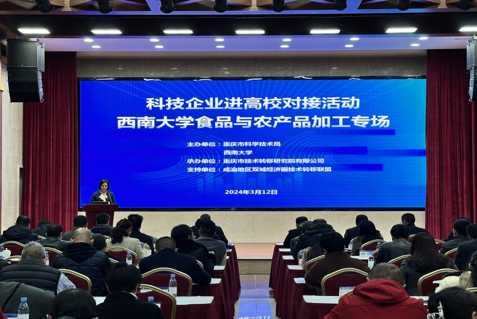 3月12日,学校联合重庆市科学技术局举办了科技企业进高校科技成果对接活动——bat365正版唯一官网食品与农产品加工专场。学校副校长葛信勇、重庆市科学技术局成果转化与创新创业处处长熊新出席对接会。学校科学技术处、国内合作处、科学中心(大学科技园管理中心、产业技术研究院)、相关二级单位,重庆市技术转移研究院有限公司等单位相关负责人,16家相关企业负责人及其代表30余人和学校相关领域科研团队代表50余人参会。