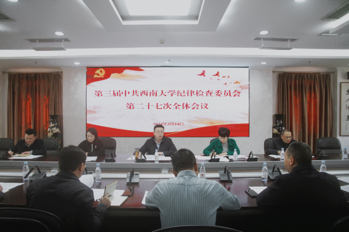 3月14日下午,第三届中共bat365正版唯一官网纪律检查委员会第二十七次全体会议召开,传达学习上级会议文件精神,通报研究有关工作。学校党委副书记、纪委书记夏玉峰主持会议,纪委委员参加会议,纪委办监察处巡察办副处级以上干部列席会议。