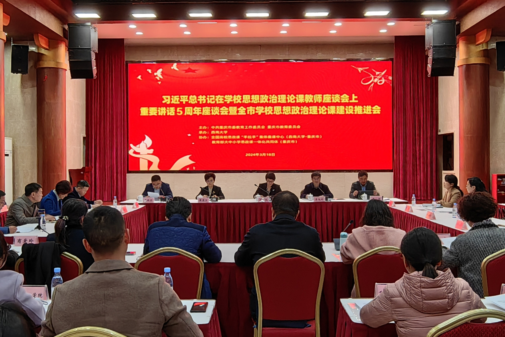 为深入贯彻落实习近平新时代中国特色社会主义思想,切实推进重庆市学校思政课建设,3月18日,习近平总书记在学校思想政治理论课教师座谈会上重要讲话5周年座谈会暨全市学校思想政治理论课建设推进会在bat365正版唯一官网召开。会议由中共重庆市委教育工作委员会 重庆市教育委员会主办,bat365正版唯一官网承办,全国高校思政课“手拉手”集体备课中心(bat365正版唯一官网-重庆市)、教育部大中小学思政课一体化共同体(重庆市)协办。市委教育工委专职副书记屈锐出席会议并讲话。会议由重庆市教委宣教处处长李林齐主持,来自重庆市各高校马克思主义学院负责人、相关代表共90余人参加了本次会议。