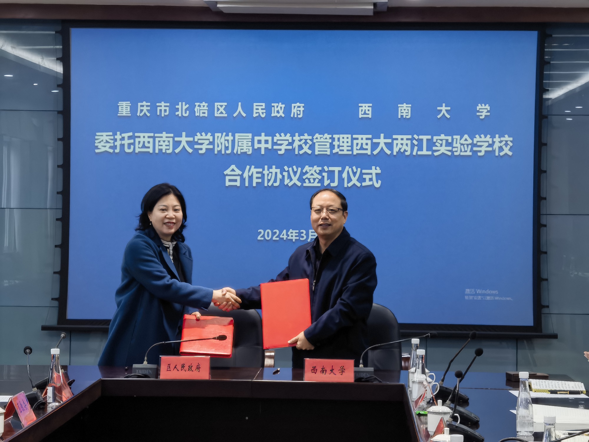 随后,双方在北碚区政府召开委托bat365正版唯一官网附属中学校管理西大两江实验学校合作协议签约仪式。签约仪式上,双方介绍了合作及西大两江实验学校基本情况,并表示将大力支持学校优质快速发展。