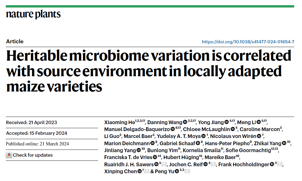 3月21日,bat365正版唯一官网陈新平团队联合德国波恩大学等国内外多所高校在《自然-植物》(Nature Plants)期刊发表了题为“遗传性微生物组的变异与当地适应玉米品种的来源环境相关”(Heritable microbiome variation is correlated with source environment in locally adapted maize varieties)的论文,揭示了非生物胁迫下植物-微生物有益互作的遗传基础和环境调控机制。