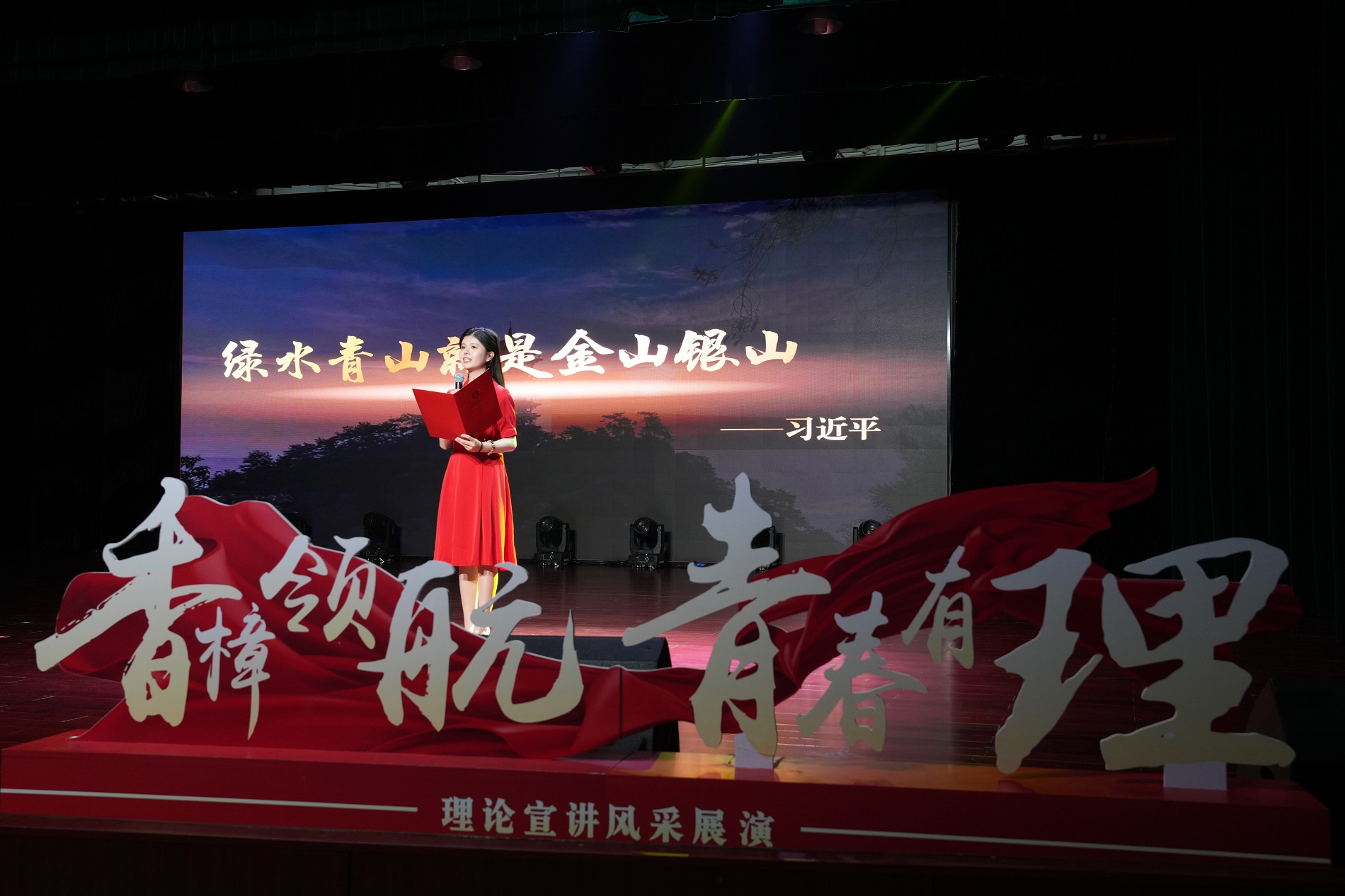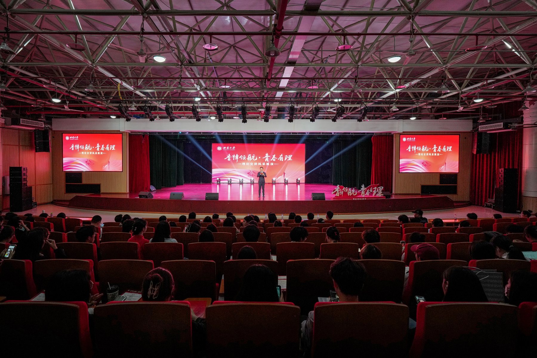 为深入学习宣传贯彻习近平新时代中国特色社会主义思想,全面贯彻落实党的二十大精神,坚持不懈用党的创新理论培根铸魂、启智润心,4月27日晚,由学校党委宣传部和团委主办的“香樟领航·青春有理”理论宣讲风采展演在圆顶报告厅顺利举行。学校党委副书记黄杰出席活动。党委宣传部、党委网络工作部,研究生院、党委研究生工作部,党委学生工作部、学生工作处、武装部,团委等职能部门相关负责人,各学院(部)师生代表300余人参加活动。