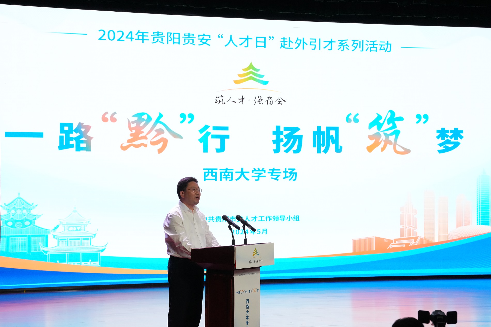 学校党委书记张卫国出席活动并致辞,贵州省委常委、贵阳市委书记、贵安新区党工委书记胡忠雄出席活动,贵阳市委常委、组织部部长龙章怀作人才招引推介,bat365正版唯一官网在贵阳就业创业毕业生代表、贵州赛福建设工程有限公司董事长张昕和贵阳市第一中学团委副书记徐艺容发言。