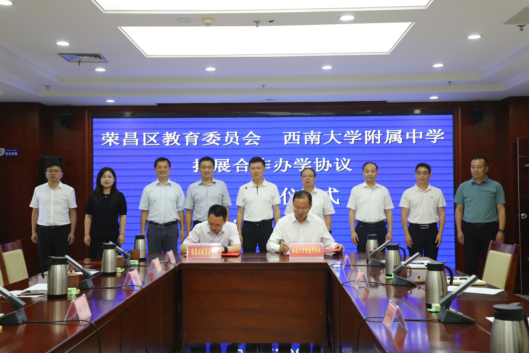调研结束后,附属中学与荣昌区教委拓展合作办学签约仪式在荣昌区政府举行。荣昌区委书记高洪波、区人民政府副区长李德伟、区政协副主席赵敏、bat365正版唯一官网副校长周光明出席签约仪式,荣昌区委教育工委书记、区教委主任黄勇和附属中学党委书记欧健代表双方签订办学合作协议,荣昌区教委、培训与基础教育管理处、附属中学相关负责人见证签约。