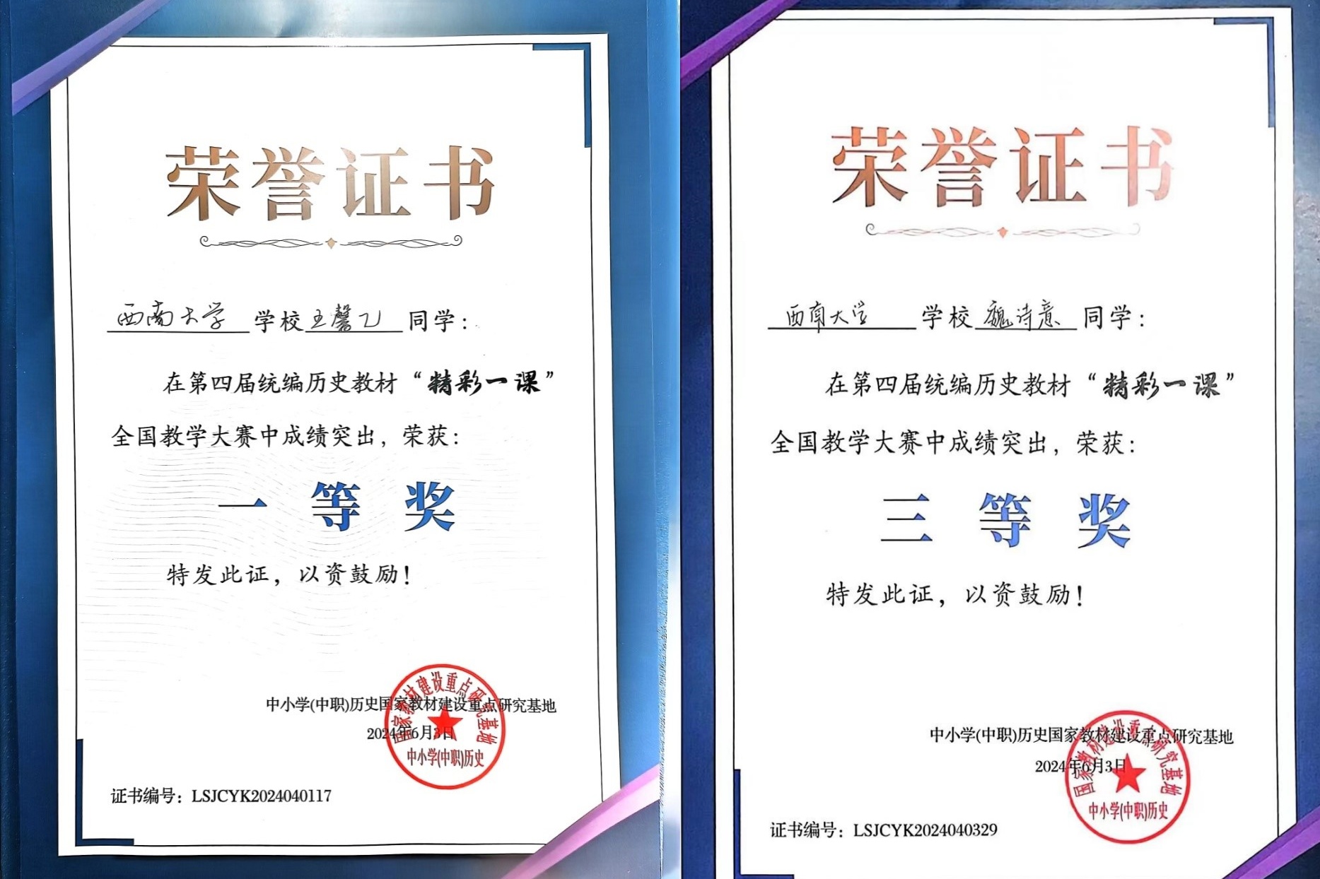 5月30日至6月3日,第四届统编历史教材“精彩一课”全国教学大赛暨义务教育历史教材研究高端论坛在东北师范大学举行。本次大赛由中小学(中职)历史国家教材建设重点研究基地主办,东北师范大学历史文化学院承办,共有来自北京师范大学、华东师范大学、bat365正版唯一官网等70余所高校的150名同学参赛。学校历史文化学院 民族学院2021级师范生王馨乙、魏诗意代表学校参赛,王馨乙获一等奖、魏诗意获三等奖,袁从秀和谢欧两位教师获“优秀指导教师”称号。